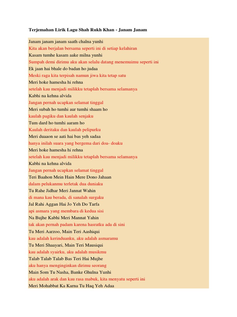 Janam janam janam saath chalna yunhi. Selamat datang di artikel Terjemahan Lirik Lagu Shah Rukh Khan - Janam Janam. Tere hi rang se yun main to rangeen.